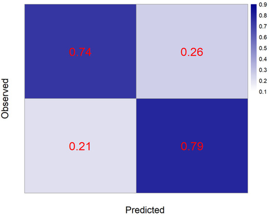 The relationship between the specificity and sensitivity is further observed by the Receiver Operating Characteristic (ROC) curve, as shown in Figure 1. The Area Under the Curve (AUC) value is the area under the ROC curve that intuitively reflects the performance of the model classification. The larger the AUC value, the larger the area, the better the classification effect. In general, an AUC value greater than 0.80 indicates that the model classification is better. The AUC value is 0.95 > 0.80, indicating that the RF model has ideal classification performance. The normalized confusion matrix is shown in Figure 2.