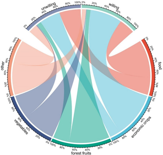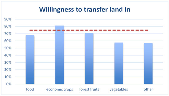 The statistics show that 74% of the interviewed farmers expressed their desire to expand the agricultural production scale, which is much higher than that in other regions of China. According to crop types, the willingness of land transfer-in is 81% of economic crops, followed by 71% of forest fruits, 68% of grain crops, and about 57% of vegetables and other (Figure 3). In general, the willingness of farmers to increase the land is high, especially that of economic crop is very strong, and the willingness of grain crop farmers is lower than the average level. The willingness direction of farmers with different crop types is shown in Figure 4; 19% of farmers growing cash crops do not want to increase land, accounting for 35% of farmers who do not want to increase land; 32% of food farmers do not want to increase land, accounting for 38% of farmers who do not want to increase land. The proportion of grain farmers willing to increase land accounts for 28% of the total farmers willing to increase land and the proportion of cash crop farmers willing to increase land accounts for more than 53% of the total farmers willing to increase land.
