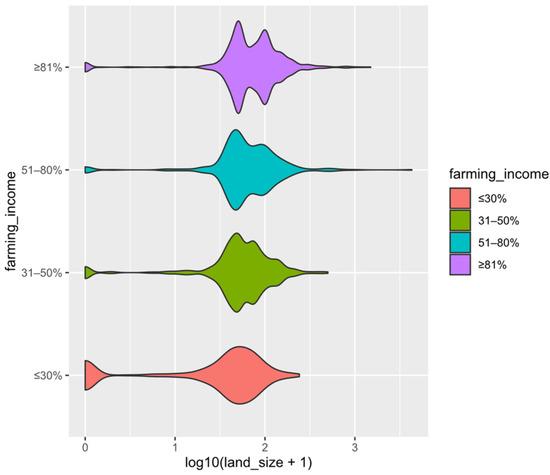 From the perspective of agricultural income ratio-land area relationship (Figure 5), the difference between the ≥81% group and ≤30% group is analyzed. The rank sum test results show that p = 0.000 < 0.05, indicating that there is a significant difference in the land area distribution between the two groups. The land area distribution of farmers whose planting income accounts for more than 81% presents a violin pattern. The farmers are mainly concentrated in two regions: near 50 mu and 100 mu and above and the number of farmers near the average is significantly narrowed. The distribution of 31–50% and 51–80% groups are similar to the more than 81% group, but the narrowing phenomenon is not obvious near the mean. The farmers whose planting income is less than 30% are mainly concentrated in the vicinity of the average land and the overall land area of farmers is smaller than other groups. Obviously, larger land operators are more willing to expand their business than small farmers and the willingness to increase land is stronger. Compared with the less than 30% group, the farmers whose planting income accounts for more than 81% occupy more land and gather around 100 mu.