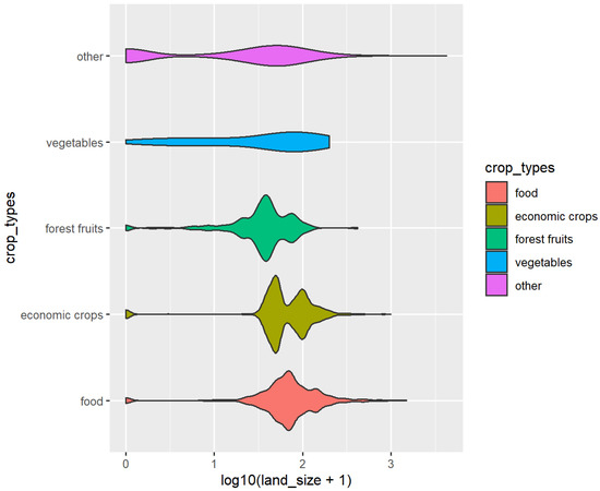 From the perspective of the crop type-land area relationship (Figure 7), the land area of grain crops and economic crops is significantly different. The rank sum test result shows that p = 0.007 < 0.05, indicating that there is a significant difference in the land area distribution of the two groups. The land area of grain crop farmers are concentrated slightly below the average. The land area of economic crop farmers is mainly concentrated in 50 mu and 100 mu, showing a clear violin type. The vast majority of grain crop farmers do not increase land.
