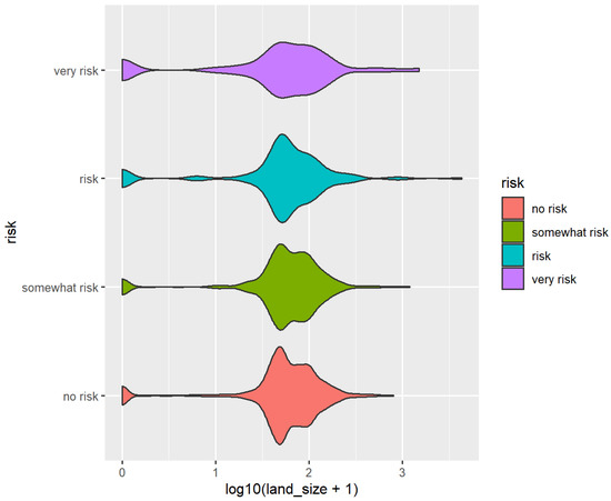 From the perspective of the risk perception-land area relationship (Figure 8), the risk perception is divided into four groups. The land area distribution is similar in the four groups. There is an obvious aggregation near the mean value and it decreases rapidly with the increase in land area. The rank sum test shows that p = 0.839 > 0.05, indicating that there was no significant difference between the high risk-perception group and the low risk-perception group. The importance of the variable “Risk Perception” in the main variables decreased significantly.
