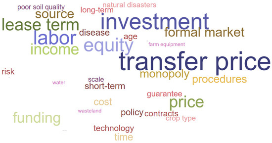 The transformation from transfer-in willingness to transfer behavior is affected by multiple factors such as transfer price, lease term, input, and income (see Figure 9). According to the survey, the reasons why farmers do not increase land mainly include the following aspects. Up to 48% of farmers said the transfer price was high; 34% indicated that the pre-investment in the land was unaffordable and lacked sufficient funds; 22% worried that the income was not guaranteed; 20% indicated limited labor; and 16% said the lease term is short. In the case of low willingness to transfer land out and the limited scale of transferable land in the survey area, a farmer’s financial situation is the dominant factor affecting land transfer. Compared with other crop types, economic crop farmers have an advantage in the circulation market with relatively high incomes, while crops such as forest fruits and essential oils are often at a disadvantage due to the limitations of requiring large upfront investment, being labor-intensive, and having long lease periods.