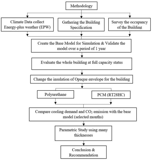 This study evaluated the energy consumption of the whole building at full capacity, followed by validation of actual energy consumption for the whole facility using a DB simulation tool. Next, the effects of using different thicknesses of PCM instead of traditional insulation material (50 mm thick) installed in walls were examined, followed by a parametric study of various PCM thicknesses installed in the walls and the roof. Figure 1 demonstrates the methodology implemented to reach the aim of this study.
