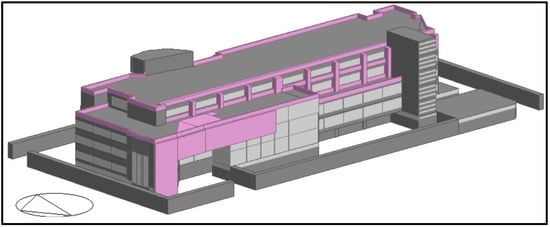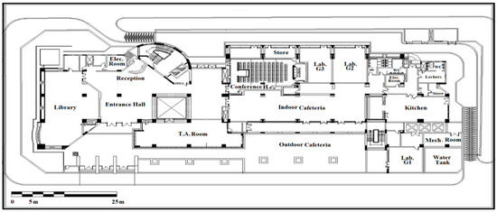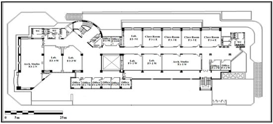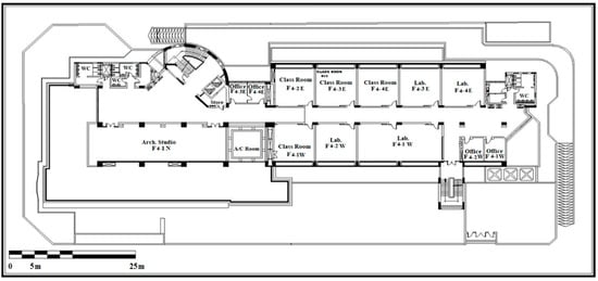 An educational building of the Arab Academy for Science, Technology and Maritime Transport (AASTMT), located in Cairo, was selected for analysis in this study (Figure 2). The case study was modeled and edited using DB software V6.1, as presented in Figure 3. All necessary data were inserted into the program. The building consists of five stories, each with a set of classrooms, offices, laboratories, and bathrooms, as demonstrated in Figure 4, Figure 5, Figure 6, Figure 7 and Figure 8. According to the actual state of the building, all design data were established using a specific inspection and selection process, and were then used as input data for the simulation model.
