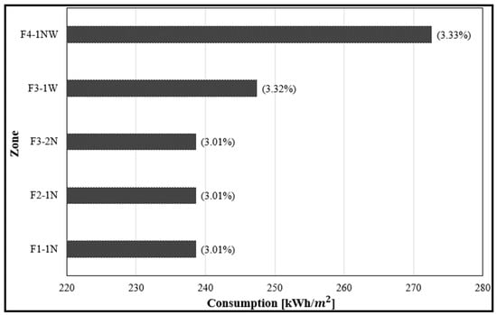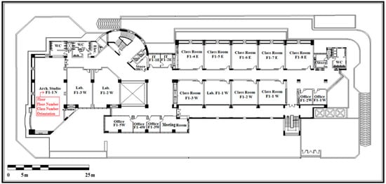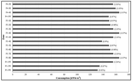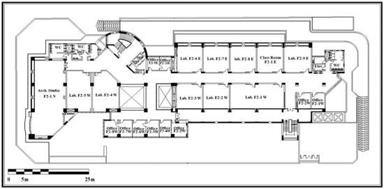 Various laboratory activities had a substantial influence on the amount of energy consumed due to different electrical devices present and according to their purposes (electrical, mechanical, chemical, and computer labs). Consequently, it would be advisable to locate labs with higher energy consumption (such as computer labs) in rooms F4-2W, F4-3E, and F1-1W, which used less energy, as shown in Figure 11.