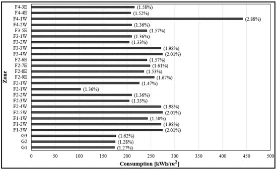 Annual energy consumption per area for all classrooms and consumption percentage of the building’s total energy consumption.