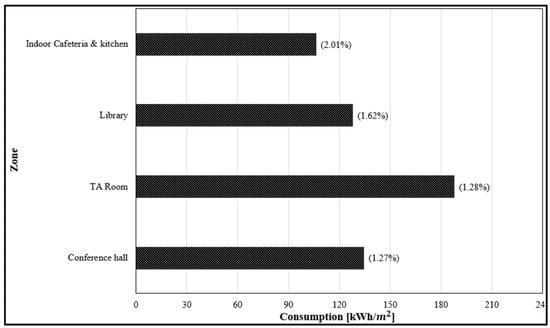 Facilities located on the ground floor received less natural lighting. For that reason, electrical lamps could be turned on for over 12 h; thus, ground floor facilities consumed the highest amount of energy compared to the rest of the building’s facilities. Figure 12 demonstrates the annual energy consumed per area for facilities located on the ground floor and the consumption percentage of the building’s total energy consumption. The results show that the conference hall used less energy while having a large occupancy capacity, whereas the indoor restaurant, kitchen, library, and teaching assistant rooms used more electricity because they were used more frequently throughout the year and had highly powered electrical devices.