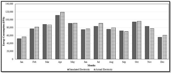 The total energy consumption of the base model, which depends fully on electricity, was determined for validation using actual electricity bills and the building’s schedules for 2021, as shown in Figure 13, which presents acceptable monthly errors that did not surpass 9% of the actual values. Any experimental study must include error analysis; therefore, it was essential to calculate the error for all measures. The computed root mean square error (RMSE) was 0.2364, which was considered acceptable.