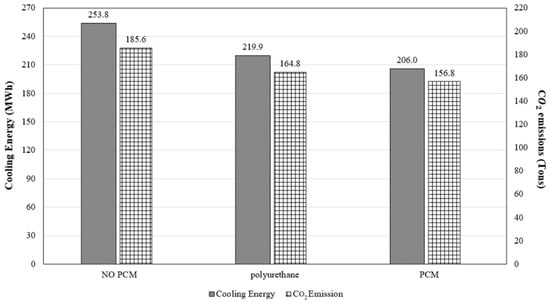 CO2 emissions are often a significant result of burning fossil fuels to generate energy. Each material’s use was measured in terms of the building’s CO2 emissions in tons, as shown in Figure 14 and Figure 15. Figure 14 presents the significant effect of using PCM to reduce energy consumption. The cooling energy consumed without a PCM was 253.8 MWh, versus 207 MWh when 36 mm thick PCM was used. Moreover, CO2 emissions decreased from 185.6 tons to 157.3 tons. Notably, increasing the PCM’s thickness more than 18 mm added almost no value, as the increase in the PCM utilization ratio was unnoticeable.