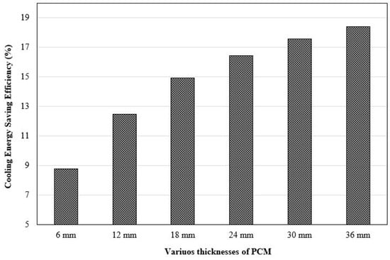 Moreover, different thicknesses of PCM were investigated in wall profiles and the roof. Compared to the reference model, the cooling demand efficiency at 6 mm, 12 mm, 18 mm, 24 mm, and 36 mm PCM thicknesses were 9.20%, 13.3%, 16.00%, 17.50%, 18.8%, and 19.70%, respectively; this highlights the effect of PCM thickness on the cooling energy consumed.