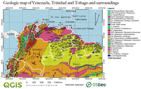 - Hackley, P.; Urbani, F.; Karlsen, A.W.; Garrity, C.P. Geologic Shaded Relief Map of Venezuela. U.S. Geological Survey, Open File Report 2005–1038, 2006. Available online: https://pubs.usgs.gov/of/2005/1038/index.htm (accessed on 1 November 2022).