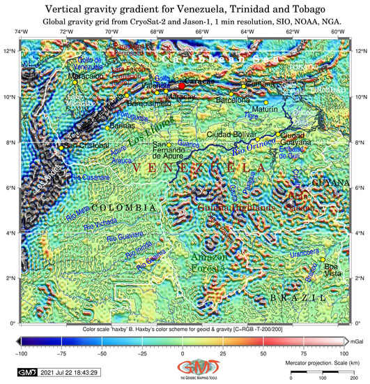 Figure 6 refers to a vertical gradient of normal gravity as an approximation in which a gravity measurement point, which is almost never placed on the reference ellipsoid’s surface, is adjusted according to geophysical corrections [88,89]. The details regarding the distribution of vertical gravity values over Venezuela, Trinidad, and Tobago showed that the lowest values (below −100 mGal) mostly correspond to the extreme amplitude of topographic changes, e.g., the abrupt borders between the mountains/hills and the margins of the bathymetric depression, while the highest values (over 100 mGal) were detected on the tops of the mountains, which corresponded well with the local geomorphology of the region.
