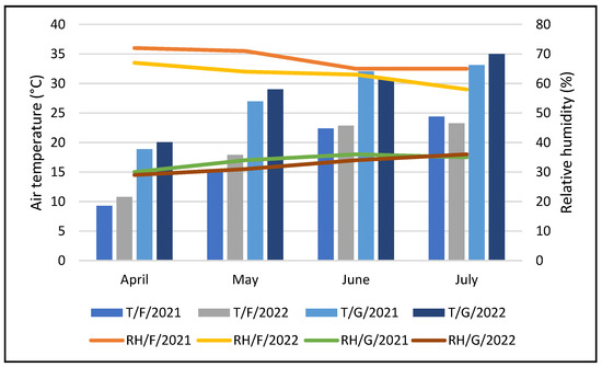 Air temperature (T) and relative humidity (RH) measured in field (F) and greenhouse (G) conditions in the vegetative period (April-July) 2021 and 2022.