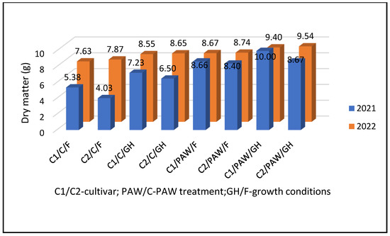 Dry matter content in pepper plant organs was different between cultivars, growing conditions, and seed treatment with PAW, as well as between years (Figure 2). The content of dry matter C1 was 7.82 g, and C2 had a dry matter content was 6.90 g. Comparing the dry matter of plants grown in different growing conditions, it was found that the dry matter of plants grown in the greenhouse was higher (8.10 g) than for those grown in the open field (6.62 g). On average, plants grown from the seeds treated with PAW have a dry matter of 8.93 g, and control has 5.78 g. Moreover, the difference between years has been established: in 2022, dry matter content was 8.63 g, and in 2021 it was 7.36 g (Figure 2).