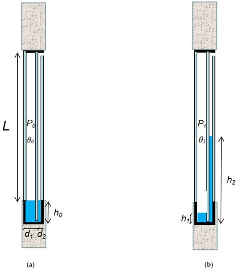 h1, h2, the heights of the liquid in the left-side and the right-side cavities in the transformed state, as shown in Figure 1b, m;