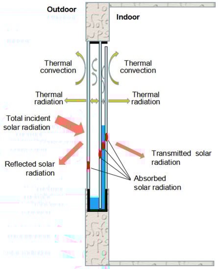 A numerical model of the liquid-infill tunable window under investigation was established and utilized to evaluate its performance under different boundary conditions. The incident solar radiation on the window surface, which is an important indoor heat source during the cooling season, should be carefully accounted for in the design of any transparent building envelop. Accordingly, the solar energy flow path within the adaptive shading window and heat transfer mechanism between the glass panes and adjacent indoor/outdoor environment is illustrated in Figure 2.