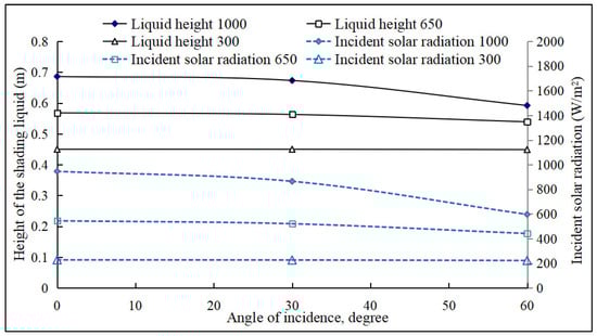 Heights of the shading liquid layer under different solar irradiance conditions.