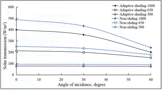 Meanwhile, the observed differences between adaptive shading case and non-shading case were smaller when global irradiance level was 300 W/m2. The comprehensive transmissivity of the triple-layer clear glass window was within the range of 0.402–0.409 at different incident angles. As for the liquid-infill tunable window, the transmissivity fell into the range of 0.334–0.340. The corresponding reductions caused by the liquid layer were quite similar, approximately 16.7% under different incident angles.