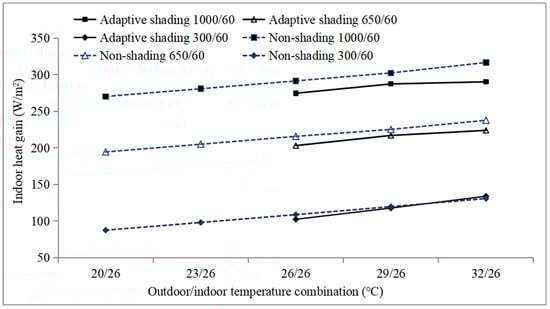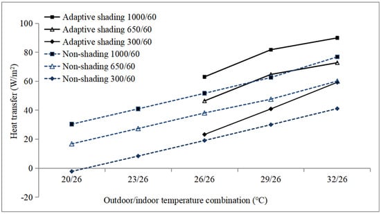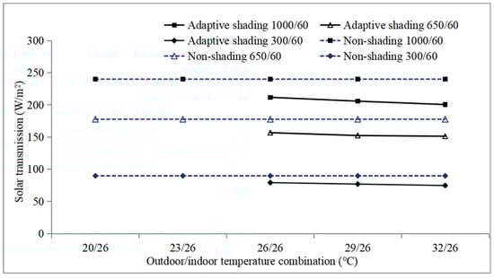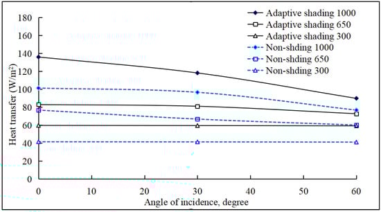 Figure 4 shows the transmitted solar energy through the window in the adaptive shading case and non-shading case under different irradiance conditions. Figure 5 shows the conductive and radiative heat transfer from the window to the room. The total indoor heat gain/loss through the window is the sum of conductive/radiative heat gain/loss and direct solar transmission, which is displayed in Figure 6. In Figure 4, Figure 5 and Figure 6, the number in the figure legend represents the global irradiance level. The outdoor and indoor air temperatures remained at 32 °C and 26 °C.