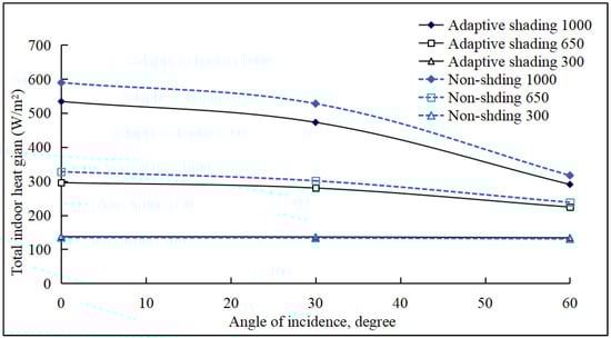 In Figure 5, the blue dotted lines remained below the black solid lines, representing the effect that the indoor heat gain from convective and radiative heat transfer between the window and the room was always larger for the adaptive shading cases. This was because of the smaller thermal insulation of liquid-infill tunable window in which the air in the right-side window cavity was partly replaced with liquid, which benefits heat flow from outdoor to indoor. For the cases with 1000 W/m2 global irradiance level, the convective and radiative heat transfer increased from 101.4 W/m2 (non-shading window) to 136.1 W/m2 (adaptive-shading window) at the 0° incident angle, from 96.7 W/m2 to 118.3 W/m2 at the 30° incident angle, and from 76.9 W/m2 to 90.0 W/m2 at the 60° incident angle. The increments were, respectively, 34.6%, 21.6%, and 13.1%. As for the cases with weaker irradiance levels, the increments were quite similar under different incident angles.