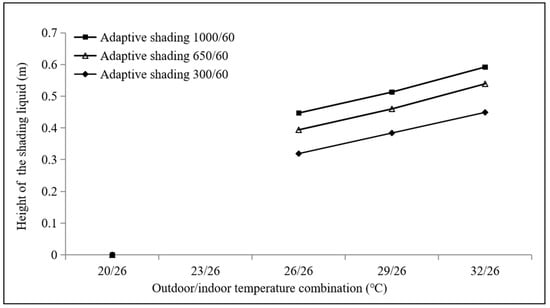 Heights of the shading liquid layer under different outdoor/indoor temperature combinations.