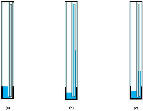Thirdly, the improved design in Figure 12a can help to releive the problem of uneven solar transmission through the upper part of the window. The design employs two shading liquid layers (three window cavities in total) and can provide full coverage of solar block under relatively moderate conditions. The middle cavity is configured to be thinner, and the colored liquid flows to the right-side cavity after fulfilling the middle cavity, as presented in Figure 12b. When incident solar radiation weakens and/or ambient temperature decreases, the temperature and pressure of trapped air declines, which initiates the window to restore the initial state through a one-way valve at the bottom of the window, as demonstrated in Figure 12c. The shading liquid flows from the middle and the right-side cavities back to the bottom of the window. The performance of this improved design requires further investigation.