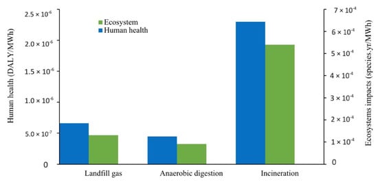 The results revealed that the highest impacts to both ecosystems and human health were related to incineration. Incineration emitted at least 10 times higher GHG emissions which resulted in higher ecosystem and human health impacts. Landfill gas had the second-highest values in both human health and ecosystem impact categories. The level of damage to ecosystems by incineration is almost four times higher than landfill gas. The incineration impact on human health is approximately 3.5 times more than landfill gas. The high level of environmental impacts by incineration compared to the other two technologies result from the significantly larger amount of GHG emissions. The AD process showed the lowest impacts on both ecosystems and human health categories, followed by landfill gas.