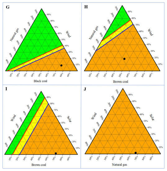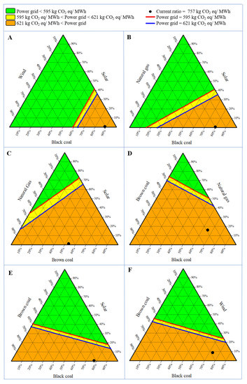 The global warming category was the only available data across all energy resources on the power grid. Therefore, the calculation of BEP was conducted on the GHG emissions to assess the consequences of the possible changes in the Australian power grid from replacing fossil fuels with renewable energy. The required changes in the share of energy sources in the power grid to decrease the average GHG emissions from the current values to the estimated BEP values was calculated by employing Equations (5) and (6). These equations can be utilised to calculate the required change in share of the two energy sources to alter the average GHG emissions. For instance, by replacing a fraction of the share of black coal in the grid with wind energy, the average GHG emissions from the grid would decrease. It also can be calculated for the ratio of the share of three energy sources. The results for three energy sources can be shown in ternary graphs. Equation (6) can be employed for finding all ratios of the share of the three energy sources when the average GHG emissions from the grid are at a specific level. In order to find these ratios, the fraction of the two energy sources was calculated when the fraction of the third energy source was considered zero. The connecting line between two calculated points on the sides of the triangle illustrates all the possible ratios for the specific GHG emissions.