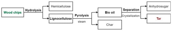 In this work, 3 types of raw materials were used, namely birch wood chips (Betula pendula, fraction 0.2–0.6 mm), water-insoluble lignocellulosic pyrolysis tar, and a composite mixture of wood chips and tar (1:1). The tar is a by-product from the two successive pilot wood processing processes: catalytic hydrolysis (catalyst is sulphuric acid) where the target product is furfural [37] and pyrolysis (450 °C) of produced lignocellulose residues in a superheated steam, where the target chemical is 1,6-anhydrosaccharide—levoglucosan. After the crystallization and isolation of levoglucosan from aqueous condensate pyrolysis tar was obtained [38] (Figure 1).