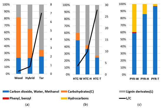 As a result of hydrothermal carbonization, the composition of volatile products of all samples changes mainly due to a decrease in the content of carbohydrate degradation products and an increase in the content of lignin derivatives, as well as carbon dioxide, water, and methanol. In the case of the hydrothermally carbonized wood (HTC-W) and hybrid material (HTC-H), the content of phenolic compounds in volatile products increased by 2 and 1.5 times and reached 38.41 and 55.62%, respectively (Table 1). In the case of tar, the increase in aromatic compounds was lower—only 5.83% and the total amount reached 67.91%. Analytical pyrolysis of samples after thermal carbonization showed that the main products in this case, were readily volatile compounds, such as carbon dioxide, water, methanol, and hydrocarbons containing various oxygen-containing groups: carboxyl, hydroxyl and ketone. In this case, there were no volatile products characteristic for wood. In the case of wood carbonizate, a small amount of phenyl and benzyl derivatives were formed, which, obviously, appeared when the aromatic structure of the carbonizate was fragmented. In the case of pyrolyzed tar, the results were similar to results obtained with the carbonized hybrid material (PYR-H).