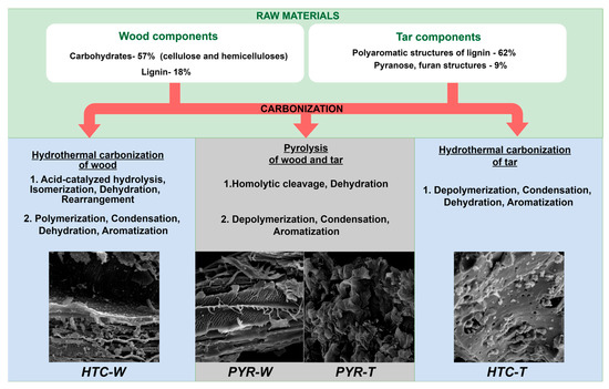 Comparing the microphotographs of wood carbonizate (Figure 3), it can be concluded that as a result of the hydrothermal carbonization, the products of the hydrolysis of hemicelluloses and regions of weakly oriented cellulose macromolecule pass into an aqueous solution and condense on the surface of wood particles, but that during thermal carbonization, the wood cell walls remain smooth, and the pores fill with carbonization products of pyrolysis products. Since tar is a liquid product and mostly consists of polyaromatic lignin derivatives, the morphology of its carbonizates is very different from that of wood carbonizates. During thermal carbonization, when volatile products form in the bulk of liquid, they swell and form a foam-like structure, thus creating a material with a scaly surface. Since during hydrothermal carbonization the reactions take place in an aqueous environment, the reaction mechanism is different and the obtained carbonizate has a denser, more condensed morphology.