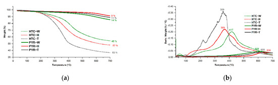 Thermogravimetric TGA (a) and DTG (b) analyses of wood, tar and their hybrids carbonizates prepared at 500 °C in an inert atmosphere (PYR-W, PYR-H and PYR-T) and at 250 °C in an aqueous medium (HTC-W, HTC-H and HTC-T).