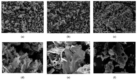 SEM analysis of activated carbon based on wood, tar and their hybrids carbonizates prepared at 500 °C in an inert atmosphere ((a)-APYR-W, (b)-APYR-H and (c)-APYR-T) and at 250 °C in an aqueous medium ((d)-AHTC-W, (e)-AHTC-H and (f)-AHTC-T). The scale bar is 50 µm.