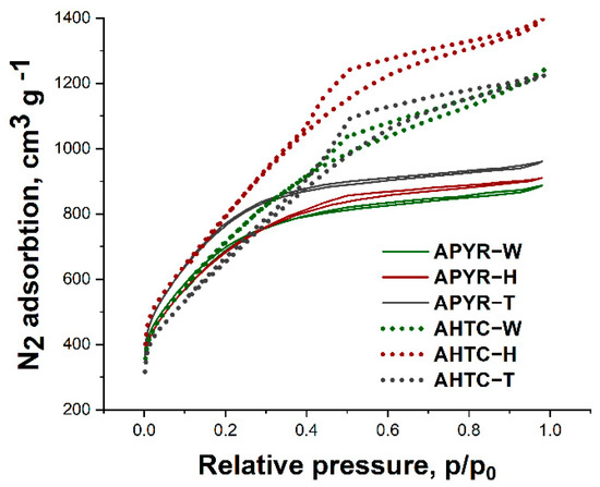 Porous structure was studied by the method of low-temperature nitrogen adsorption. Although carbonization environment and temperature did not influence elemental composition and specific surface area, the volume of adsorbed nitrogen varied significantly in the studied samples. Judging by the volume of adsorbed nitrogen and the shape of the isotherms, the hydrothermally carbonized carbon materials are micro-mesoporous and pyrolyzed carbon materials are microporous (Figure 6). According to Dubinin–Radushkevich theory, adsorption in micropores takes place according to the volume-filling mechanism, but in the presence of mesopores at relative nitrogen pressures exceeding 0.4, adsorption takes place according to the polymolecular condensation mechanism and is accompanied with the appearance of hysteresis on the adsorption isotherms [43,45].