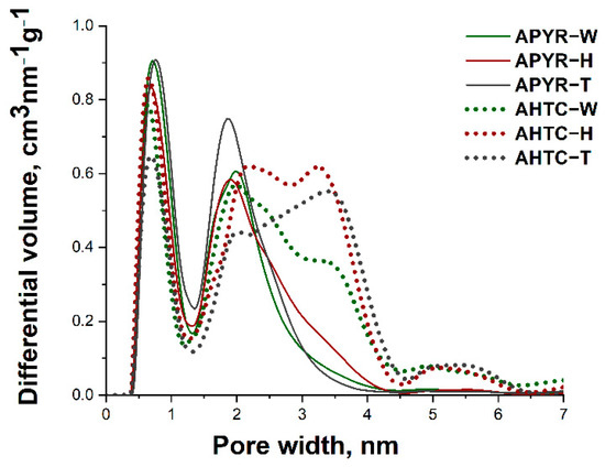 Pore size distribution of activated carbon based on hydrothermally carbonized samples (AHTC-W, AHTC-H and AHTC-T) and pyrolyzed samples (APYR-W, APYR-H and APYR-T).