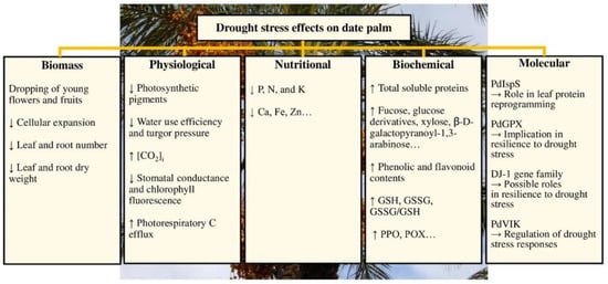 Drought is an abiotic stressor that constitutes a major threat to date palm. Drought stress is governed by factors such as the dynamics of temperature and precipitation/rainfall. Its impact is multidimensional, as it severely affects plants’ biomass, physiological, nutritional, biochemical, and molecular profiles (Figure 1). Thus, the plant’s yielding potential is often negatively impacted in terms of overall performance and product quality [75].