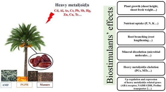 AMF, PGPR, and organic amendments constitute biological tools that hold tremendous potential to achieve sustainable agriculture. In addition, these environmentally friendly tools can assist the plants to withstand drought (Figure 2), salinity, and heavy metal(oid) (Figure 3) stresses. In this regard, available data corroborate the beneficial effects of biostimulants’ co-inoculation on growth, as well as yield statuses of date palm under drought, salinity, and heavy metal(oid) constraints [133,134].