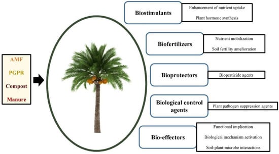 The in-common effects of AMF–PGPR, plus compost or not, manifest through the mobilization and solubilization of P, improvement of K and N content, exudation of organic acids, soil stabilization, activation of the antioxidant defensive machinery, production and modulation of plant hormones, and soil enrichment in the organic matter [30,90]. These crucial effects come under the umbrella of major roles played by biostimulants, executing biofertilizers, bioprotectors, biological control agents, and bio-effector effects (Figure 4). Biofertilizers essentially boost fertility and plant nutrition; bioprotectors work as biopesticides; biological control agents protect against pathogens; and bio-effectors modulate the plant’s performance through direct/indirect patterns [29,136]. Thus, date palm plants treated with biostimulants can develop resilience to drought stress, salinity, and heavy metal(oid) contamination, thanks to the improved robustness and immunization against abiotic stresses.