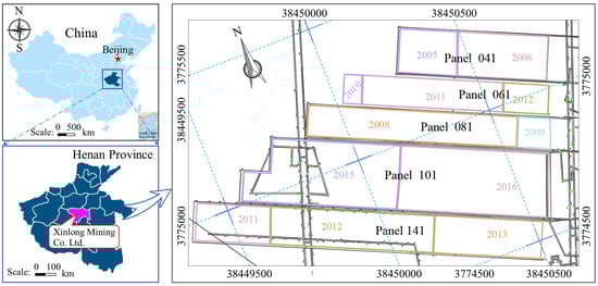 Xinlong Mining Co., Ltd. is located 6.0 km southwest of Yuzhou City, China, the coalmine is delineated by 28 coordinated inflection points, which is 8.5~13.4 km long from east to west, 4.5 km wide from south to north, and covers an area of 43.8 km2. The north and east are slightly inclined plains in front of mountains, with flat terrain, densely distributed villages, and ground elevation of +105~+120 m. The west and south are hills, and the ground elevation gradually decreases from west (+325 m) to east (+105 m). The designed production is 0.9 Mt/a, the mining thickness of No. 21 coal seam is about 4.5 m, the mining depth is 424~634 m, and the dip angle is 5~18°. At present, the 11 mining area has been completed, the panel distribution and its mining time in the west wing of 11 mining area are shown in Figure 1.