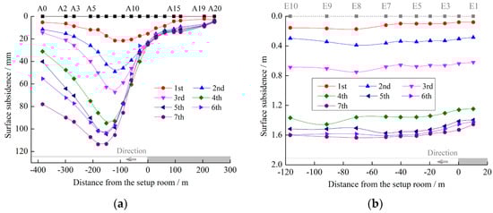 In combination with the mining time of each working face, an observation line with a spacing of 30 m is arranged on the strike and dip of panel 141 and 061, respectively. The observation time of 141 working faces is from November 2011 to March 2014, nine leveling surveys and four comprehensive observations were carried out. The observation time of panel 061 is from September 2011 to October 2012, during which eight leveling surveys were conducted. The strike subsidence curve is shown in Figure 2 based on the monitoring data.
