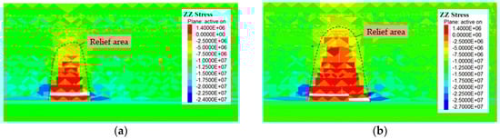 It can be seen from Figure 4 that with the working face advancing forward, the abutment pressure at the working face boundary is 15.8~29.8 MPa, which is about 2~3 times the original rock stress. The pressure relief area with an arch shape appears in the rock above the working face, and the normal stress phenomenon appears in some overburden near the coal seam, indicating that there is a local tensile stress area in the overburden. When the working face advances 80 m, the pressure relief area reaches the maximum, under the old roof pressure, the local rock strata gradually compact and a compacted area appears. In the process of advancing to 120 m, the pressure relief area is no longer developed upward, while the compacted area continues to expand to the top of the pressure relief area. As the working face continues to advance, there is no obvious change in the range of the relief area at the open cut side, the width of the relief area at the working face side is basically stable and moves with the working face, and the range of compacted area in the middle continues to expand, and the width of the relief area at the open cut side is always smaller than that at the stopping line, which also verifies that the overburden breaking angle at the open cut is greater than that at the stopping line [33]. It can be seen that the overburden in the middle of the goaf is in a compacted state, while the overburden structure exists at the boundary of the working face, indicating that the boundary of the working face is the main area where the overburden voids exist.