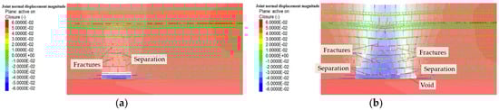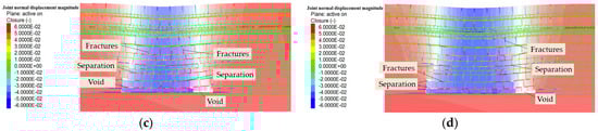 From Figure 6, it can be seen that when the face has advanced 30 m, the height of the caved zone of the overburden rock reaches the maximum, at the meantime, the rock strata in the goaf have no bearing effect and only accumulate in the goaf to form a pressure relief area. When advancing 45 m, the masonry beam structure appears in the overburden at the side of the open cut, at which time the overburden failure enters the crack zone range, and the contact state between the middle of the caved zone and the rock strata above gradually changes from no contact to point-surface, line-surface, and surface-surface contact. When advanced 61 m, a temporary masonry beam structure is formed again at the working face, the separation space of the lower rock strata is compacted, and the separation between the upper rock strata is intensified, meanwhile, the overburden structure on the mining side only shows dynamic evolution, and the change of gap distribution mainly occurs on the fracture side of the panel. When it is advanced to 78.5 m, the mining fractures develop below the sub-key stratum, the overburden failure height reaches the maximum, and the breaking angle of the rock stratum at the mining side is smaller than that at the open cut side with distributed asymmetrically. The rock stratum in the middle goaf forms a compacted area due to the closure of the gap, while the two ends of the goaf present a pressure relief area due to the overburden structure. Therefore, when the working face reaches critical mining, the overburden failure height reaches the maximum. The rock stratum gap in the middle of the fracture zone is gradually compacted, and the overburden failure height at goaf boundary and the caved zone in the middle is the main areas where the overburden gaps exist.