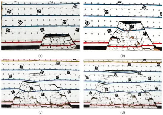 The failure characteristics and evolution of the overburden structure: (a) advance 30 m, (b) advance 45 m, (c) advance 61 m, and (d) advance 78.5 m.