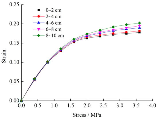It can be seen from Figure 7 that the strain increase rate of the five groups of particle-size crushed stone in the low-stress stage is greater than that in the high-stress stage. At the initial stage, the contact mode between crushed stone particles is mainly point-point, which makes up a very loose skeleton with a large gap size, and connectivity between gravel particles is good, and the deformation develops rapidly. With the increase of stress, a part of crushed stone is compressed and deformed or even broken, small particles fill the gaps to form a more compact structure, and the contact gradually transits from point-point contact to point-face and face-face contact. Meanwhile, the ability of a crushed stone to resist deformation gradually increases, so the strain increases rate in the low-stress stage is greater than that in the high-stress stage.