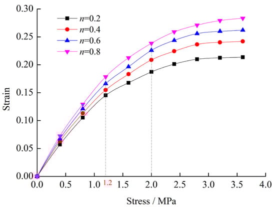 It can be seen from Figure 8 that at the initial stage of stress application, the strain of broken rocks in each group of graded increases rapidly under different gradation indexes. When the stress exceeds 1.2 MPa, the strain of crushed stone rises slowly, and the strain gap between each group of crushed stone becomes larger, mainly due to a large number of gaps between different particle sizes of crushed stone, which is easy to deform under stress, and the crushed stone gap is compressed to form. When the stress is greater than 2.0 MPa, the strain gap of each group of the crushed stone changes obviously, mainly because the proportion of large-size crushed stone increases with the increase of grading index, and the porosity is easier to compact with the rise of gradation index, the edges of large-size broken rocks grind each other and become smooth, and the generated small size rock blocks fill the gaps of the rock blocks. Therefore, the crushed stone group with index n has a relatively sizable final strain value.