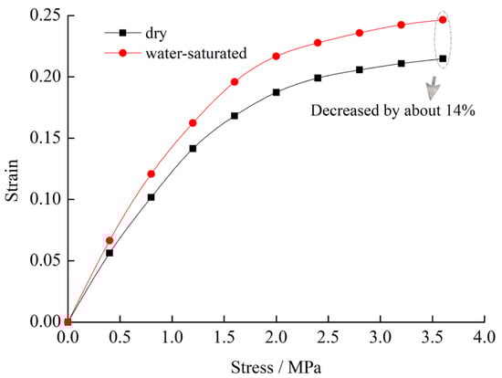 As shown in Figure 9, the strain of water-saturated crushed stone under the same stress is obviously greater than that under the dry state. It is mainly because the water weakens the cohesion between the rock particles, water molecules reduce the connection between the internal particles of the rock sample so that the energy required for rock fracture is reduced, the strength of the crushed stone is diminished, and deformation is more likely to occur under load. Meanwhile, large size crushed stone will be broken into smooth particles again and fill the gap again so that the rock strain increases. In addition, the bearing capacity of broken sandstone is reduced by nearly 14% under the water-saturated influence, which indicates that the water content has a significant impact on the compaction of broken sandstone.