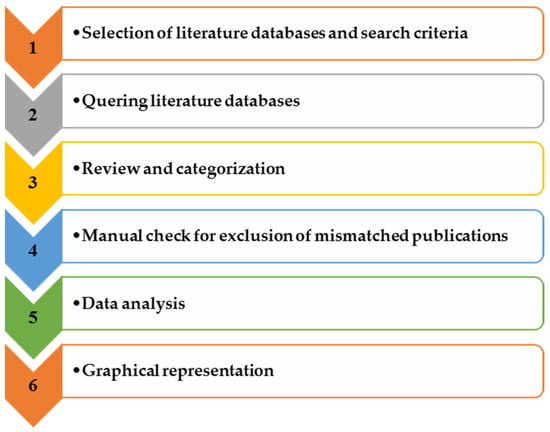 This study comprised six main steps of analysis (Figure 1). Firstly, the literature databases and search criteria were defined. Secondly, the selected literature databases were inquired based on the selected search criteria. We inquired the “abstract”, “keywords”, and “title” sections of the databases and the entire text for the chosen publications published in the English language between January 2001 and September 2022, being aware of the limitations in regard to the search field of each literature database. In the third step, all the selected publications were thoroughly reviewed and categorized into subgroups. This was followed by the fourth step in which each publication was manually checked in order to exclude any publications focusing on areas outside the Mediterranean region. A quantitative analysis of all the publications was performed in order to extract the relevant information (fifth step). Finally, in the sixth step, the outputs of the analysis were represented in the form of concise graphs. More details on each step of the proposed review process are provided in the following sub sections.