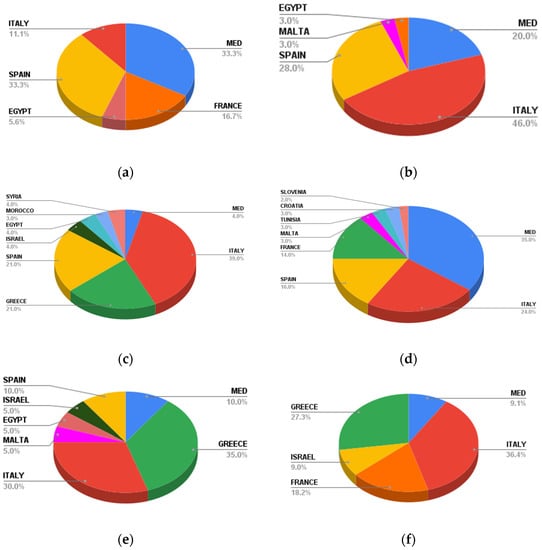 The graphical representations include both publications dealing with a specific study area and those focusing on the Mediterranean region as a whole (MED). Some of the published articles depict case studies of coastal areas from more than one Mediterranean country. As inferred by Figure 2b,c,f, the higher number of publications on coastal risk assessment (46%), vulnerability assessment (39%) and multi-disciplinary approach to SLR (36.4%) is centered in Italy. Bonaldo et al. [59] studied the outcomes of multi-disciplinary instruments for understanding coastal dynamics and for assessing the coastal vulnerability to erosion and SLR in Italy. Sekovski et al. [51] developed a coastal vulnerability index using an analytical hierarchy process to assess the coastal vulnerability to SLR in Italy.