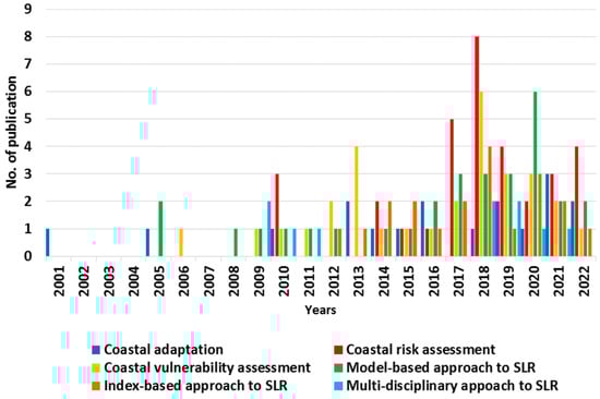 As for the publication trend, the results of this study reveal that, on average, all criteria showed an increasing trend over the years (Figure 3); thus, revealing the increasing interest on climate-related coastal risk assessment and associated issues. The peak number of studies was observed in 2018. This was the time when there was a high number of publications for coastal risk assessment, vulnerability assessment and model-based approach to SLR-related research; however, there was a drop in the field-based studies starting from 2019, probably due to the impact of COVID-19, with the exception of those related model-based approaches to sea level rise and coastal adaptation. Conversely, 2022 appears to show a revival of scientific activity. Figure 3 highlights a remarkable rise over the years, of publications related to coastal risk assessments and index-based approaches to SLR. Furthermore, between 2001 and 2009 there were hardly any publications related to most of the accounted approaches. Hence, through this graphical representation, we show how research on coastal risk assessment has been increasing significantly since 2010. This review has considered the publication date of each paper as the time frame for both the case study-based and review-based papers.