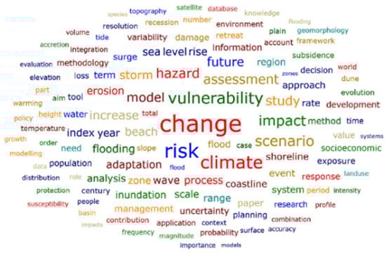 The word cloud (Figure 4) provides a visual representation of the most repeated words in the 143 publications analyzed in this review. It shows that the most frequent word occurring in the abstracts of the analyzed papers was “change” (168 occurrences), referring to climate, sea-level, and coastline/shoreline changes. Other frequent words were risk (144 occurrences), vulnerability (99 occurrences), scenario (97 occurrences) and impact (91 occurrences). The words risk and vulnerability mainly occurred in association with the terms assessment and index. The word scenario was mainly associated with the word climate; among the climate scenarios, the RCP8.5 was the most frequently cited. The word impact, was often addressed as a potential/expected/future impact; this suggests that forecasting coastal impacts is a crucial issue. Moreover, it is notable that, in the analyzed abstracts, the most cited impacts were socio-economic ones.